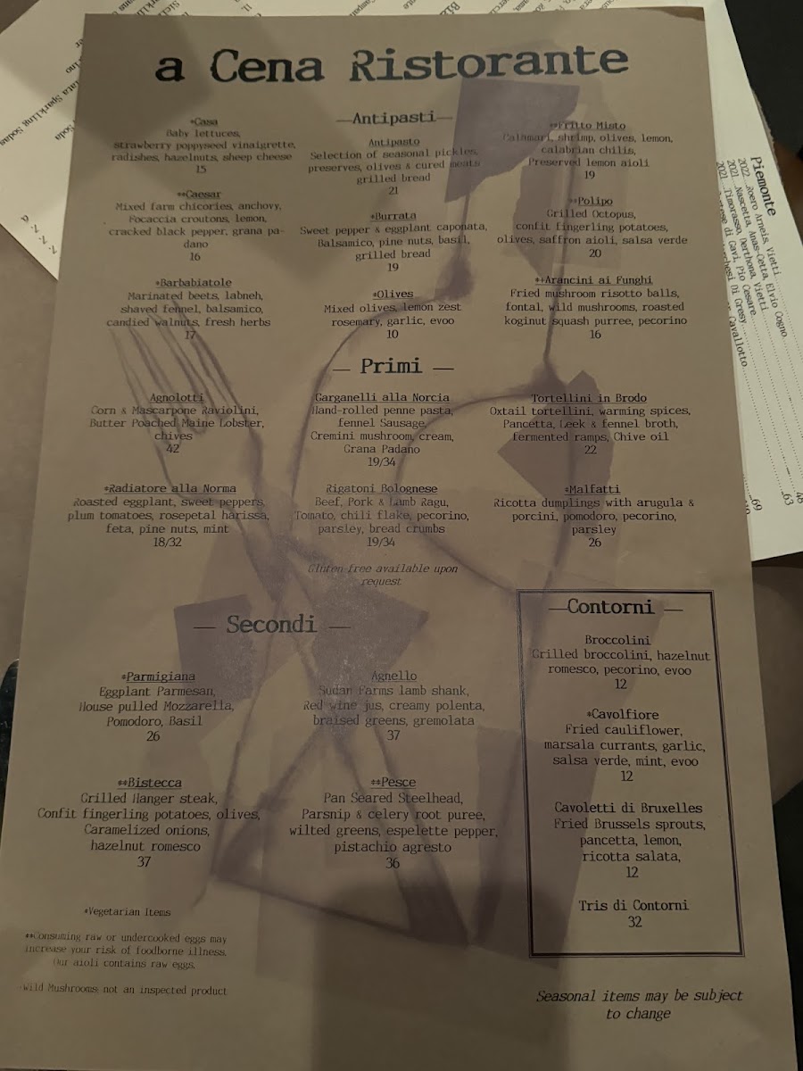 Diving into the pastas, the Garganelli Alla Norcia showcases hand-rolled perfection paired with housemade fennel sausage, while the Rigatoni bursts with a rich beef, pork, and lamb ragu that transports you to Italy with every bite. The secondi offerings, like the grilled hanger steak and the sumptuous Lamb Shank, promise a flavorful finish to your dining experience. Customers rave about the cozy atmosphere and outstanding service, making a Cena Ristorante not just a meal, but a memorable outing.